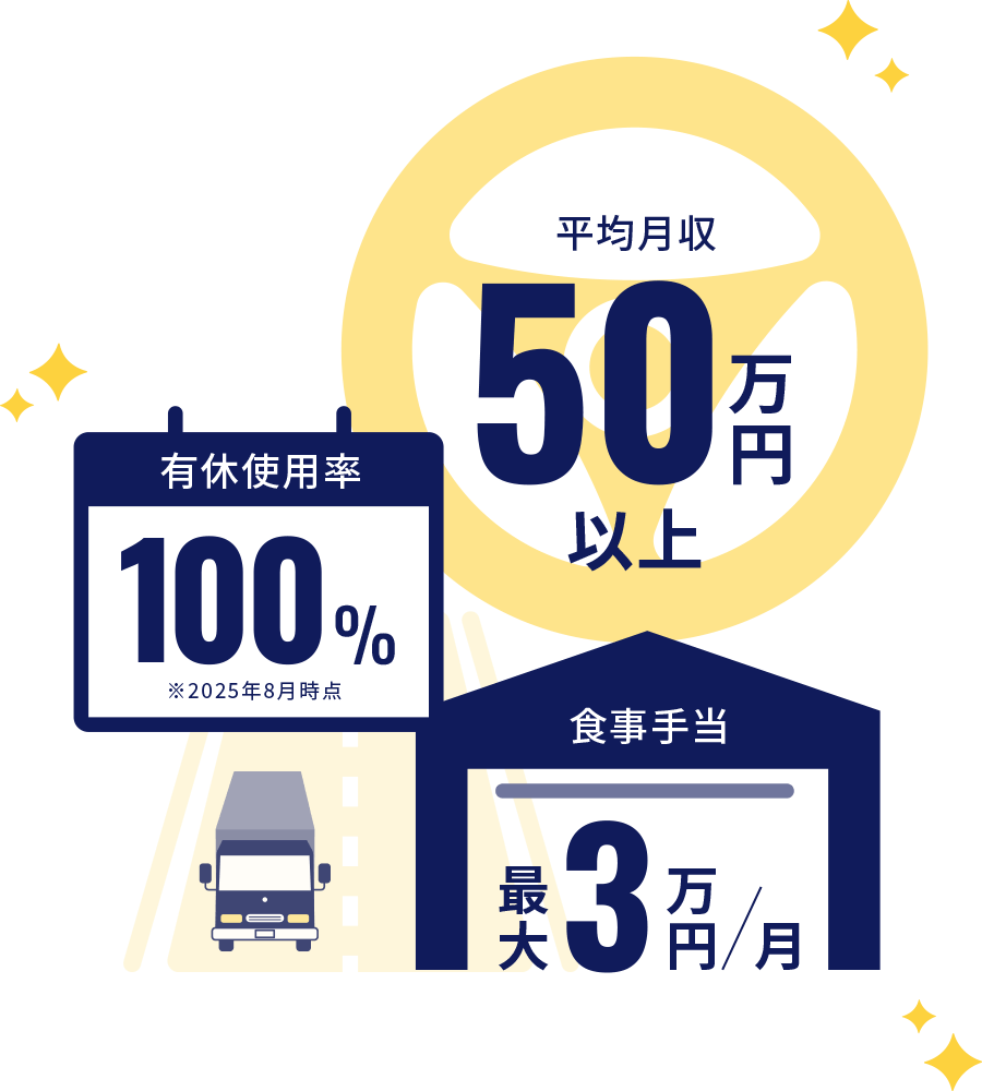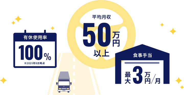当社の大型トラックドライバー職は、平均月収50万円以上、頑張り次第で月収60万円以上も可能です。